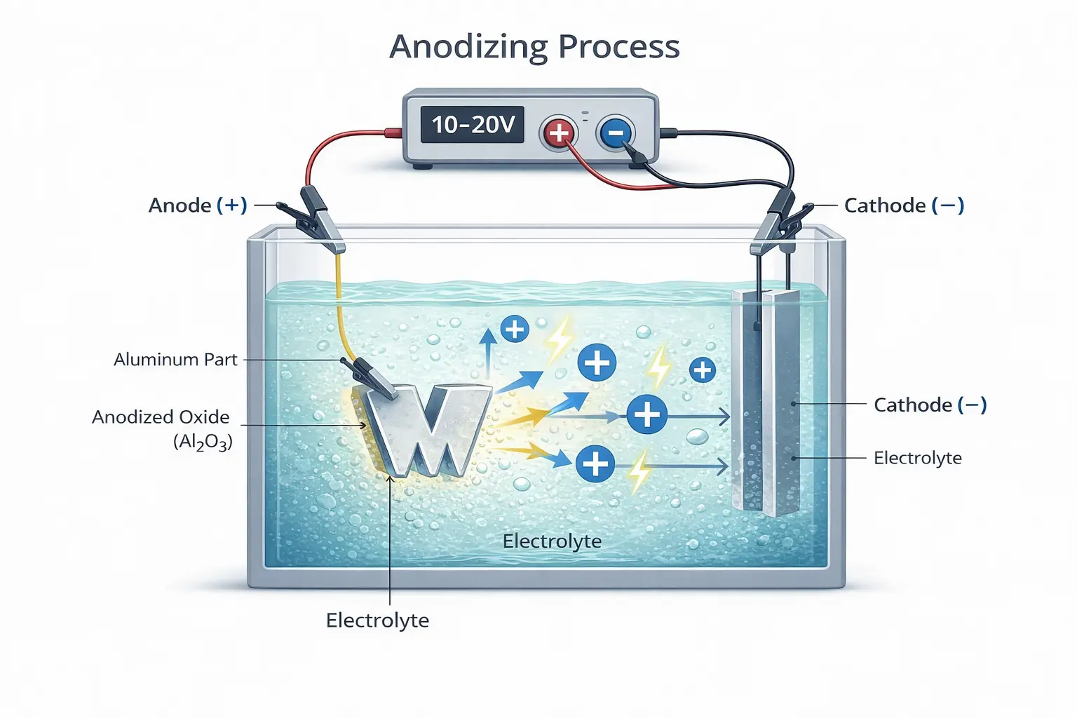 From a technical standpoint, the part being treated functions as the anode in the circuit. When current flows through the system, negatively charged oxygen ions from the electrolyte migrate toward the anode and react with the aluminum surface, forming a stable aluminum oxide layer. At the same time, positively charged hydrogen ions in the electrolyte are reduced at the cathode, which is typically made from T-6063 aluminum alloy or another inert, conductive material. Both the anode and cathode are connected to an external power supply, which provides the energy required to sustain the reaction and complete the circuit.